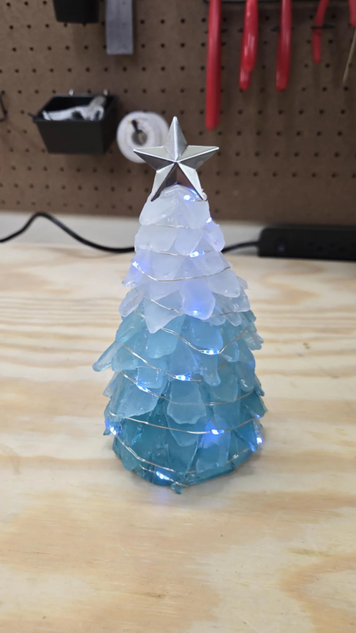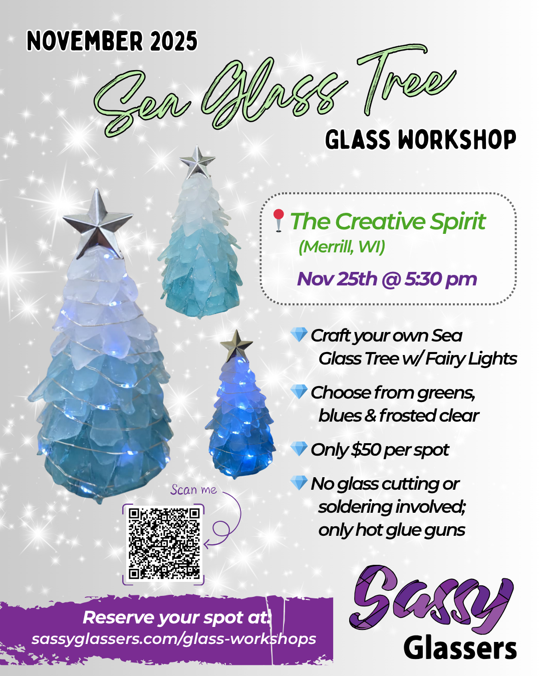 Craft your own Sea Glass Tree with Fairy Lights! You’ll hot-glue sea glass onto a cone, add fairy lights, and walk away with one glowing tree for $50 (pick from 6 colors — frosted clear, and hues of green & blue). TICKET REQUIRED / LINK FOR TICKETS IS SHOWN BELOW (Select "Sassy Glassers").